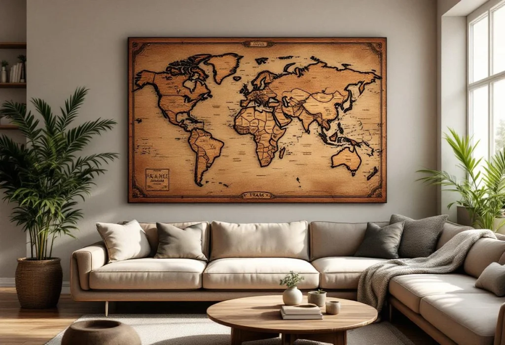 Associer la carte avec d’autres matières naturelles – lin, rotin ou pierres apparentes – renforce le côté chaleureux et authentique de l’ensemble. L’objectif : créer une harmonie où chaque élément trouve sa place autour de la carte géographique, pour un résultat cohérent et inspirant.